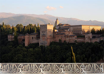 *Альгáмбра (исп. Alhambra, от араб. قصر الحمراء каср аль-хамра — «красный замок») — архитектурно-парковый ансамбль, расположенный на холмистой террасе в восточной части города Гранада в Южной Испании. Основное развитие получил во времена правления мусульманской династии Насридов (1230—1492), при которых Гранада стала столицей Гранадского эмирата на Иберийском полуострове, а Альгамбра — их резиденцией.