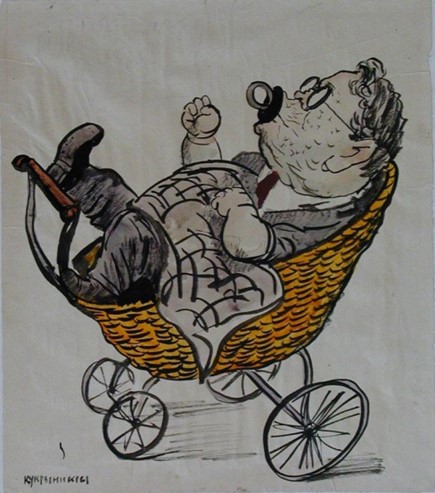 Шарж в стиле гротеск. Бумага, тушь, кисть, акварель. Неизвестный художник.