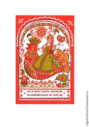Традиционный русский лубок с элементами псевдо-советской символики. Лубочные картинки - одна из интересных форм народного творчества. Религиозная тематика со временем уступила в них место жанровым, бытовым сценкам с назидательными и юмористическими сюжетами. С графической точки зрения лубку присуща яркая декоративность (и это несмотря на то, что для раскраски использовали только красный, малиновый, желтый и синий цвет), доступность образов и нарочитая простота. Самый примитивный пример – раскраска.
