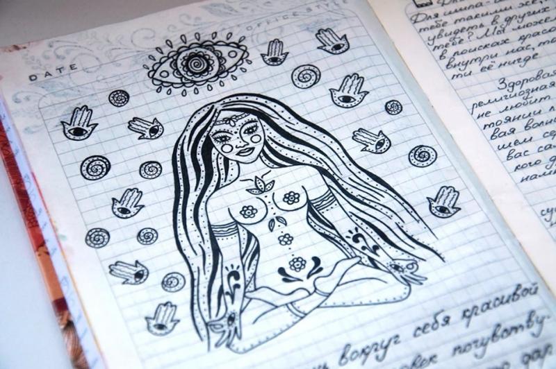 Набросок в женском дневнике. Скетч — это быстрый рисунок, который передаёт настроение сцены.