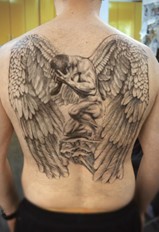 Тюремная живопись как жанр нашла свое отражение главным образом в татуировках. Данная работа является ярким представителям одной из разновидностей тюремной татуировки – художественное тату. Такие обычно наносят в качестве оберегов и просто «для красоты». Наиболее популярный участок тела под «роспись» - грудь. Конкретно в этой работе за плечами появляется Ангел святой. Ангел – символ надежды. Цветок - знак сообщества. По числу лепестков (иногда с инициалами) определяется количество участников, судимых по 1-му делу.