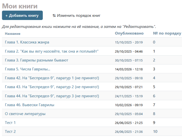 (Книги "Тест1" и "Тест2" - без произведений, поэтому на страничке не видны, нормалёк)