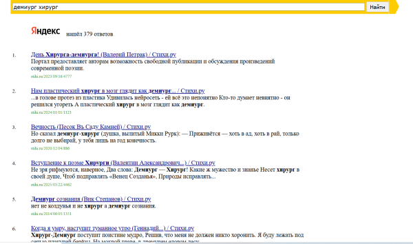 Вот скрины. И это только поисковик на стихи.ру. Была еще на поэзии.ру, в избе-читальне и самиздате  - там еще около 30, но о них потом, если возникнет надобность.
