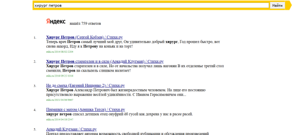 Хирург-Петров: 759 совпадений, из них 11 – полное совпадение. Т.е. авторы пишут именно о хирурге, именно Петрове.