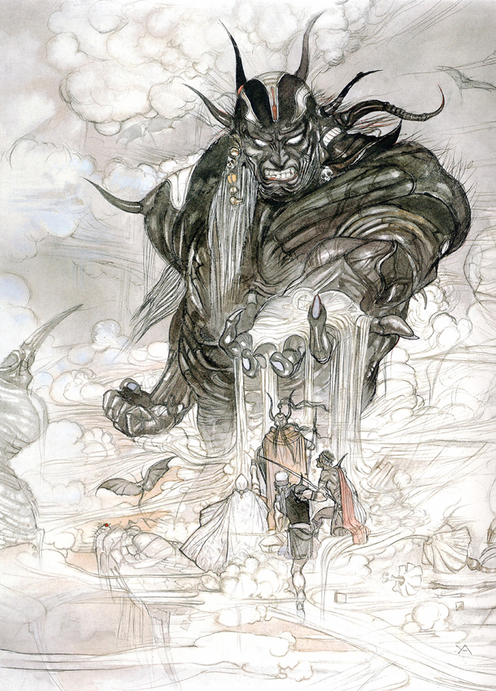 This gallery includes original artwork for the game by Yoshitaka Amano (as is usual with these artworks, they don’t always correspond to the final appearance of characters or places in the game), as well as sprites from the main iterations of the game, artwork from Dawn of Souls, CG renders and FMV screenshots from Final Fantasy Origins.  As far as the optional bosses from the GBA and PSP versions are concerned, you’ll only find those which are specific to this game (eg. the FFIII ones, since FFIII has never been released on GBA, and the graphics for its PSP version are the same as the DS ones). Meaning that if you’re looking for the FFIV  optional bosses’ sprites, for example, you’ll have to look in the FFIV gallery (since FFIV has been published on both the GBA and the PSP).